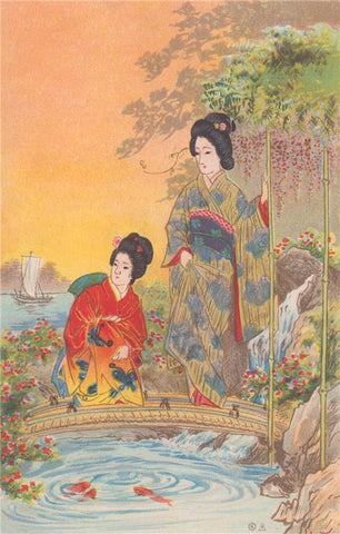 JN-437 Two Geishas at Koi Pond - Vintage Image