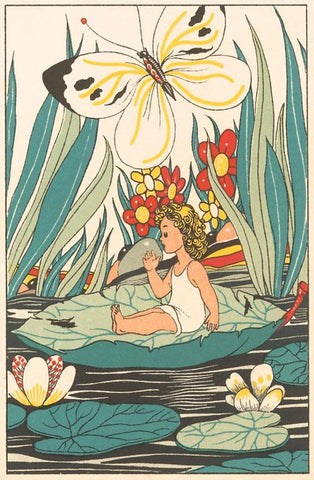 KF-41 Girl Waking on Floating Leaf - Vintage Image