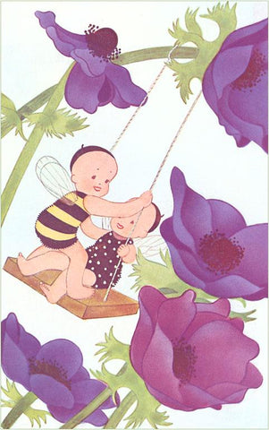 KF-274 Baby Fairies Swinging in Purple Poppies - Vintage Image