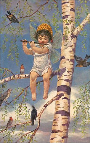 KF-287 Boy Fairy Playing Flute in Birch Tree - Vintage Image