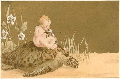 KF-592 Baby with Violin Riding Sea Turtle - Vintage Image