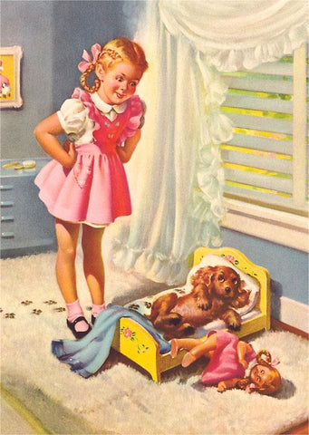 KF-649 Girl Watching Puppy in Cradle - Vintage Image