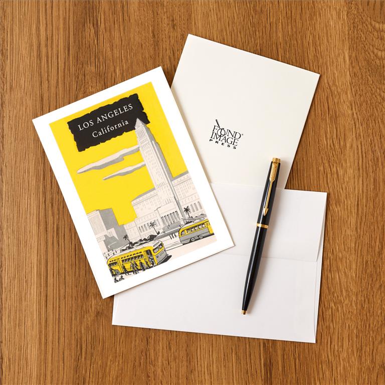 Celebrate the vibrant history and iconic landmarks of Los Angeles with Found Image Press's exclusive wholesale collection. Our vintage postcards, greeting cards, desktop calendars, art prints, stickers, and magnets capture the essence of the City of Angels. Ideal for retailers wanting to offer unique and nostalgic items, each product is crafted with premium materials for lasting quality. Explore a curated selection that showcases the beauty and spirit of Los Angeles.