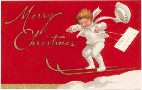 MC-01 Merry Christmas, Boy Skiing - Vintage Image
