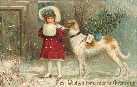 MC-197 Best Wishes for Christmas, Girl with Borzoi - Vintage Image