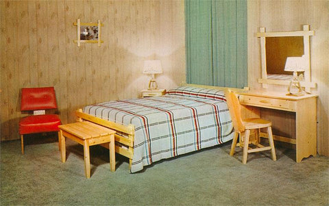 MR-06 Motel Room with Red Chair and Plaid Bedspread - Vintage Image