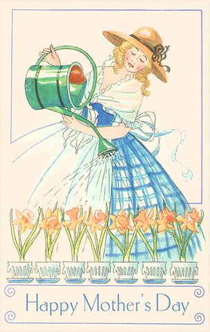 MY-75 Woman in Hoop Skirt Watering Daffodils, Mother's Day - Vintage Image