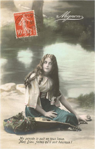 MS-167 French Girl with Mandolin by River - Vintage Image
