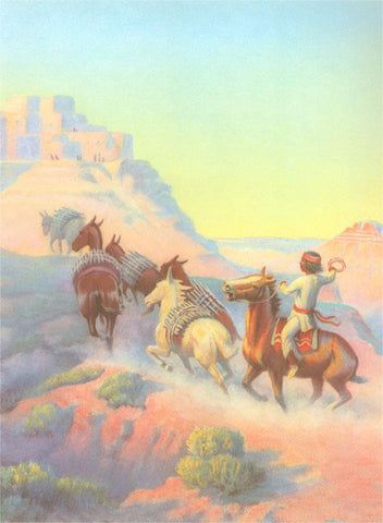 NA-238 Navajo Boy Herding Pack Horses - Vintage Image