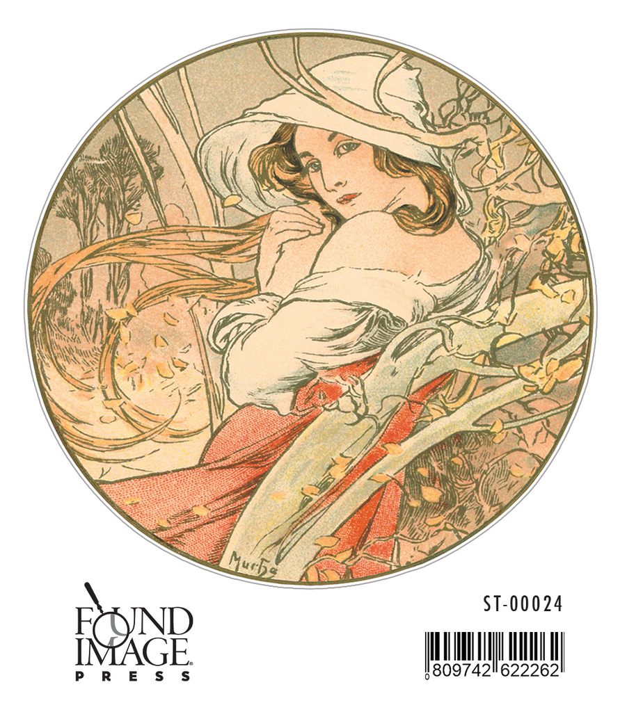 This long lasting, die cut, vinyl sticker of an Art Nouveau illustration by Alphonse Mucha is distiled from image AT-11 in our Art Misc. category. It's perfect for adding a bit of vintage pizzaz to water bottles, notebooks, laptops or any other surface that needs a little pick-me-up. Made in the USA.