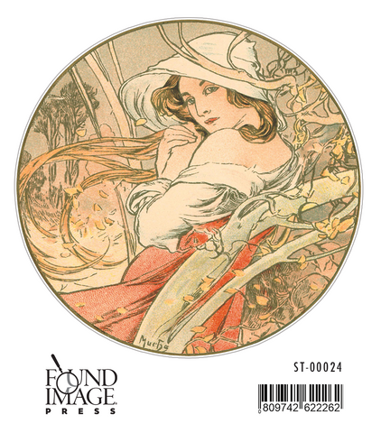 ST-24 Mucha Woman in Red Dress - Vintage Image, Sticker - 12 qty