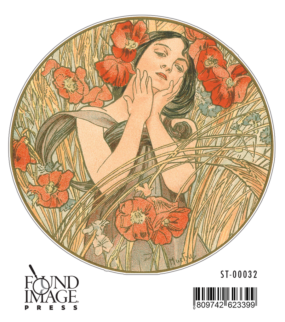 ST-32 Mucha Woman with Red Poppies - Vintage Image, Sticker - 12 qty