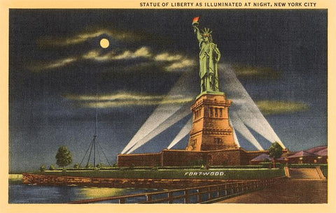 NY-438 Moon over Statue of Liberty, New York City - Vintage Image