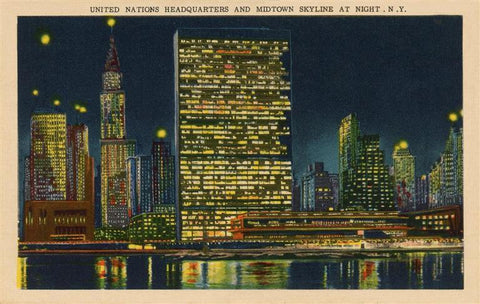 NY-1467 United Nations Headquarters and Midtown Skyline at Night - Vintage Image