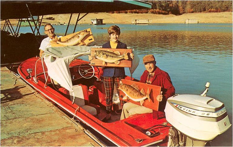 NP-399 People in Motor Boat Holding Plaques with Fish - Vintage Image