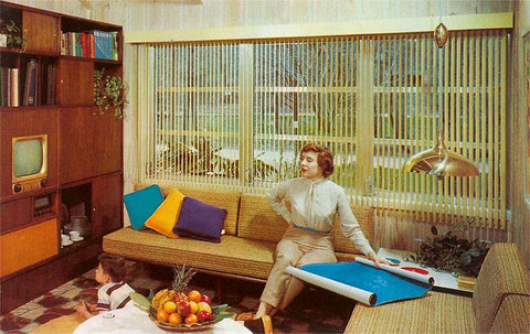 NP-283 Woman Reading Plans in Living Room - Vintage Image