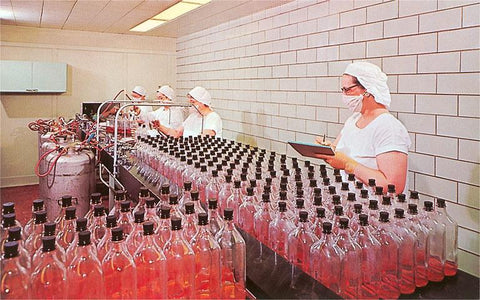 NP-379 Masked Women Filling Bottles at Plant - Vintage Image