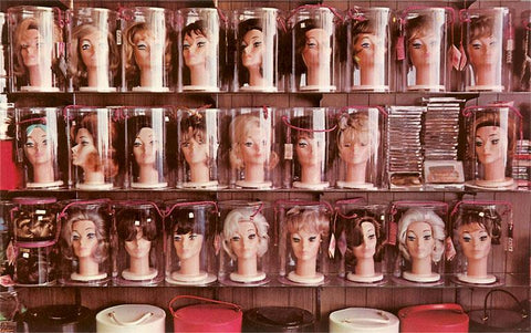 NP-395 Lots of Wigs on Mannequins' Heads - Vintage Image