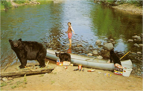 NP-414 Bear Family in Canoe, Kid Screaming - Vintage Image