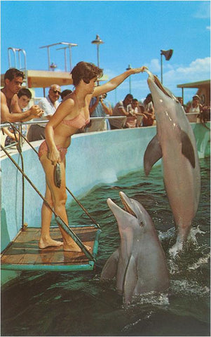 NP-532 Woman in Bikini Feeding Porpoise - Vintage Image