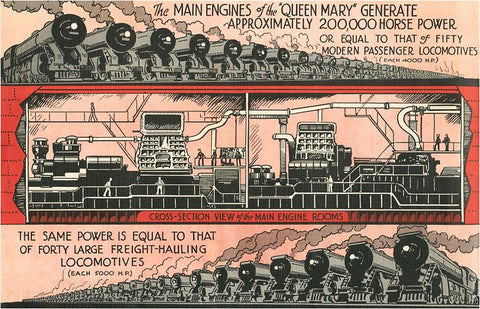 SS-63 Queen Mary vs. Locomotives - Vintage Image