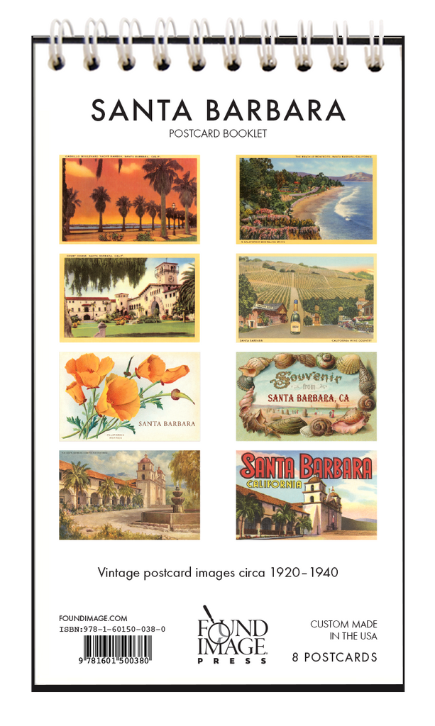 This postcard booklet features 8 vintage images of Santa Barbara, California from 1920 to 1940. Vintage views of palm tree lined streets, beaches, poppies, vineyards, the Courthouse, and the Mission grace the 8 perforated tear-out pages of this sweet little book. Spiral bound, it is printed on acid-free, natural white, heavy card stock, and measures 3.5x 6.25. Give as a gift, enjoy as a memento, or tear out postcards to mail to your friends -- all you need is a postcard stamp! Made in the USA.