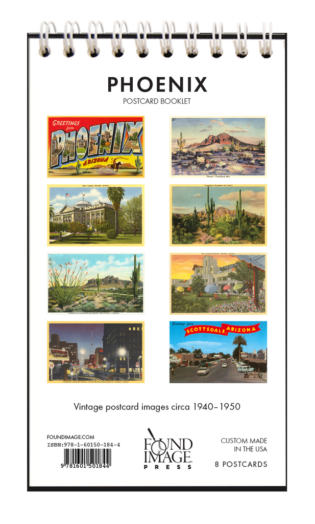 Greetings from Phoenix, Arizona! This postcard booklet features 8 beautiful vintage postcard images of Phoenix from 1940 to 1950. Vintage views of Camelback Mountain, Downtown at night, the Biltmore Hotel, and the exotic plants of the Arizona desert grace the 8 perforated tear-out pages of this sweet little book. Spiral bound, it is printed on acid-free, natural white, heavy card stock, and measures 3.5x 6.25. Give as a gift, enjoy as a memento, or tear out postcards to mail to your friends -- all you need is a postcard stamp! Made in the USA.
