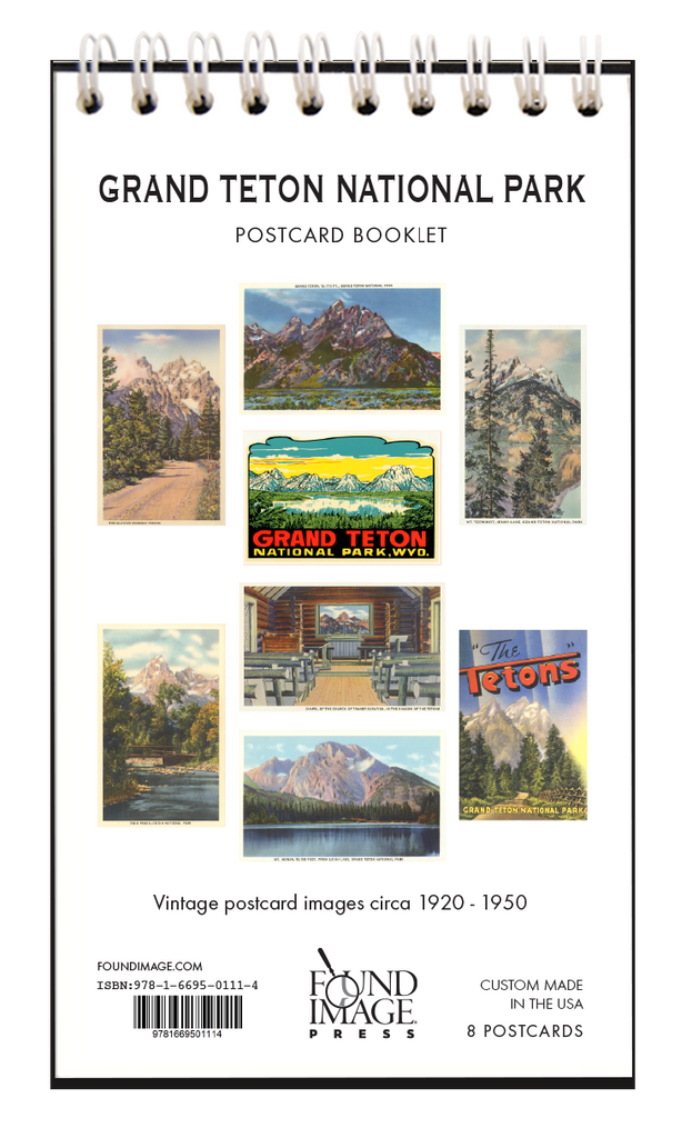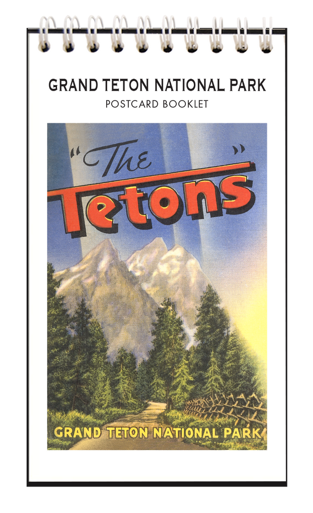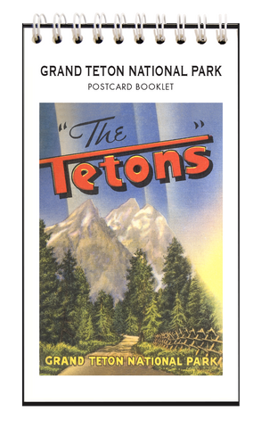 This postcard booklet features 8 vintage images of Grand Teton National Park in Wyoming from 1920 to 1950. Vintage views of Grand Teton Peak, Mt. Moran, Mt. Teewinot, Jenny Lake, and Leigh Lake grace the 8 perforated tear-out pages of this sweet little book. Spiral bound, it is printed on acid-free, natural white, heavy card stock, and measures 3.5” x 6.25”. Give as a gift, enjoy as a memento, or tear out postcards to mail to your friends — all you need is a postcard stamp! Made in the USA.