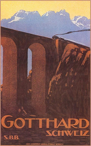 RR-72 Train Going over Bridge in Gotthard, Switzerland, Graphics - Vintage Image