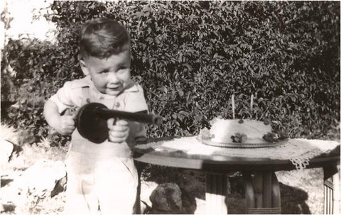 SN-03 Little Boy with Toy Machine Gun and Cake - Vintage Image