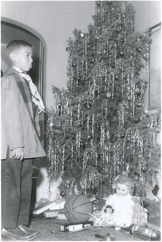 SN-33 Boy Sticking out Lower Lip at Christmas Tree - Vintage Image