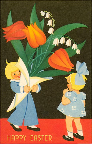 EA-144 Happy Easter, Children with Large Bouquet - Vintage Image