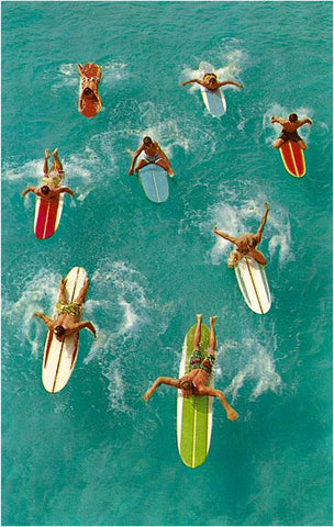 SU-19 Surfers Paddling on Multi-Colored Boards, From Above - Vintage Image