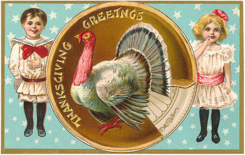 TD-12 Greetings, Children with Turkey - Vintage Image