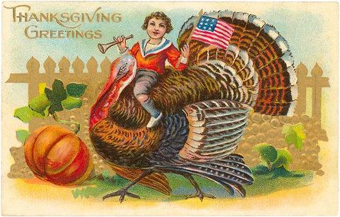 TD-19 Greetings, Boy Riding Turkey - Vintage Image