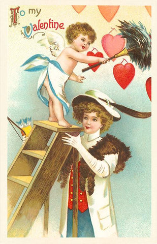 VL-83 To My Valentine, Woman Holding Ladder for Cupid - Vintage Image