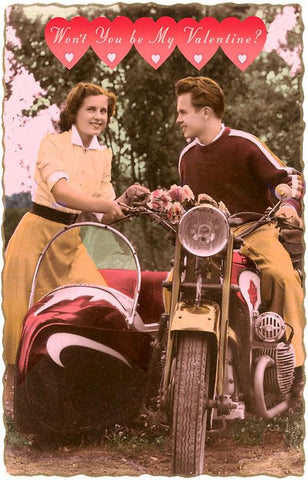 VL-157 Wont You Be My Valentine? Couple with Motorcycle and Sidecar - Vintage Image