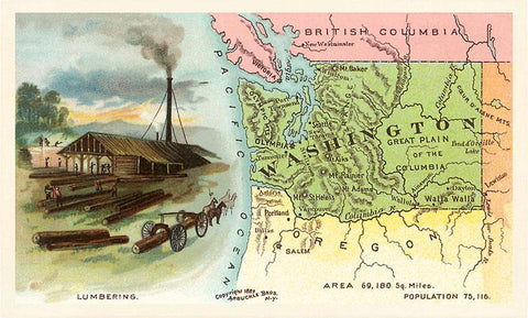 WA-332 Lumbering Scene, Map of Washington - Vintage Image