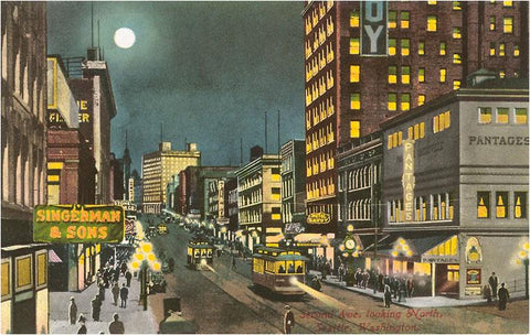 WA-382 Second Avenue, Seattle at Night - Vintage Image
