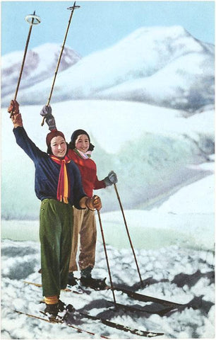 WS-74 Women Standing on Skis with Poles Raised - Vintage Image