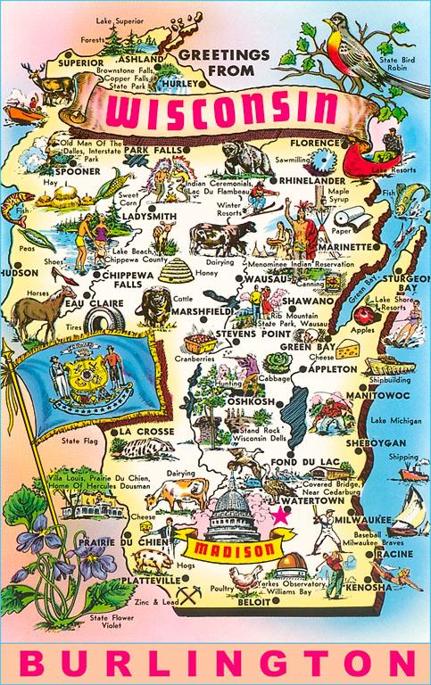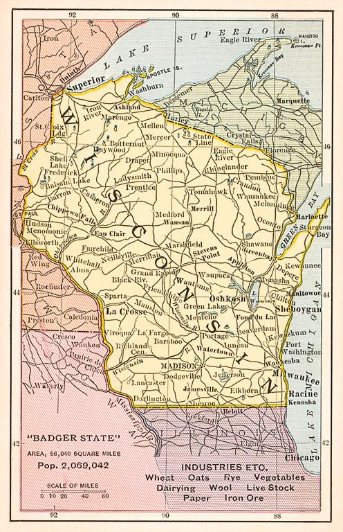 WI-121 Map of Wisconsin - Vintage Image