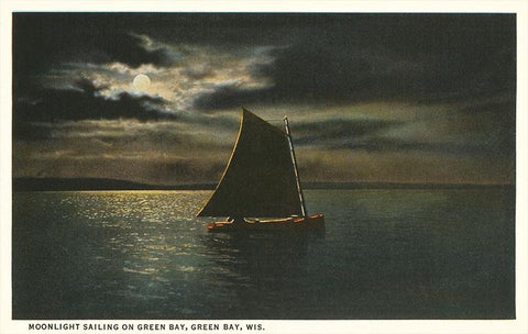 WI-86 Moon over Sailboat on Green Bay, Wisconsin - Vintage Image