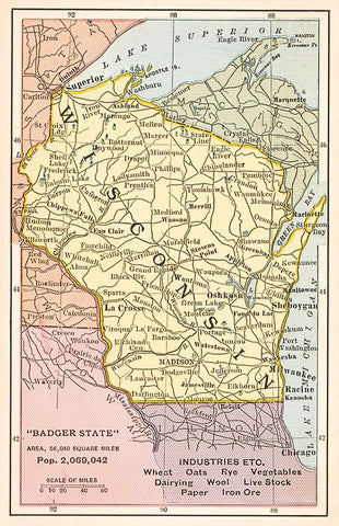 WI-253 Map of Wisconsin - Vintage Image