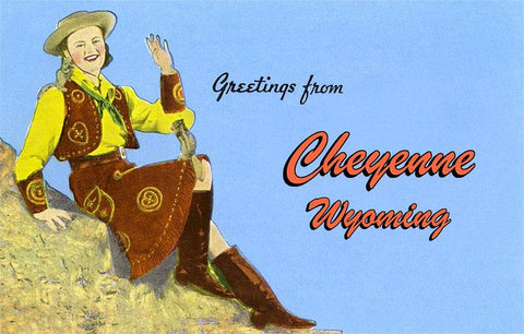 WY-166 Greetings from Cheyenne, Wyoming, Waving Cowgirl - Vintage Image