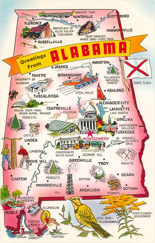 AL-136 Map of Alabama Attractions - Vintage Image