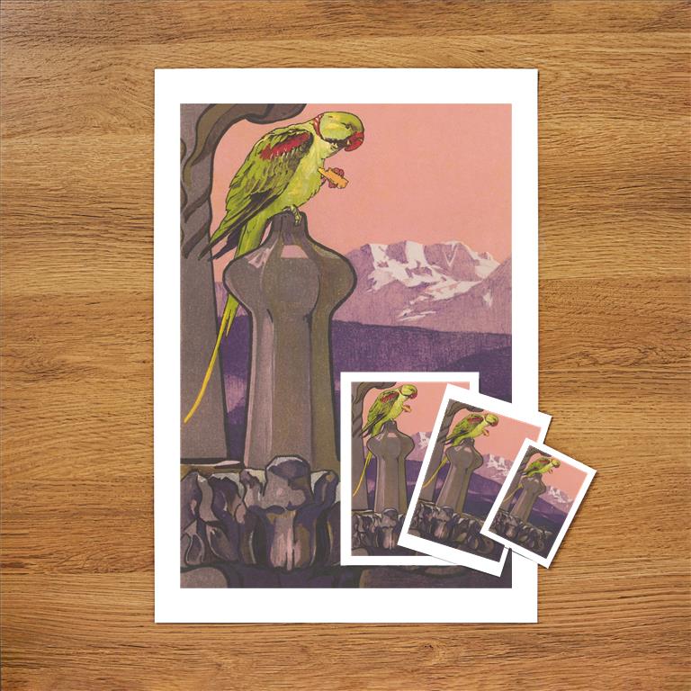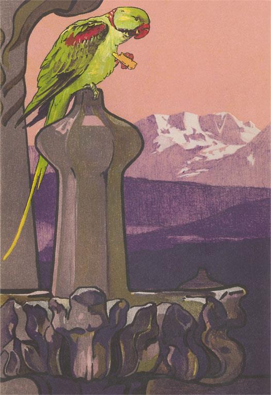 BD-476 Parrot on Fountain - Vintage Image