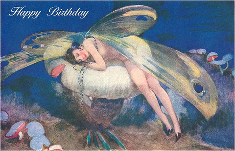 HB-393 Happy Birthday, Fairy Sleeping on Toadstool - Vintage Image