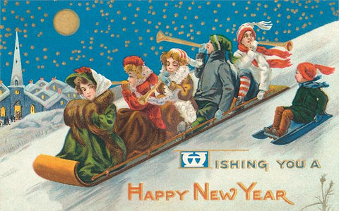 HN-26 Happy New Year, Revelers on Toboggan - Vintage Image