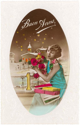 HN-58 Buon Anno, Woman with Flowers - Vintage Image
