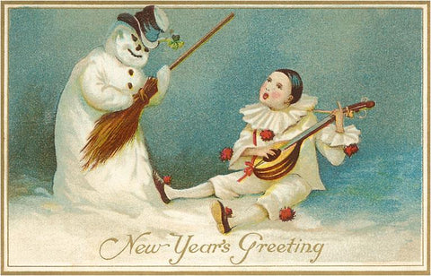 HN-77 Happy New Year, Clown and Snowman - Vintage Image